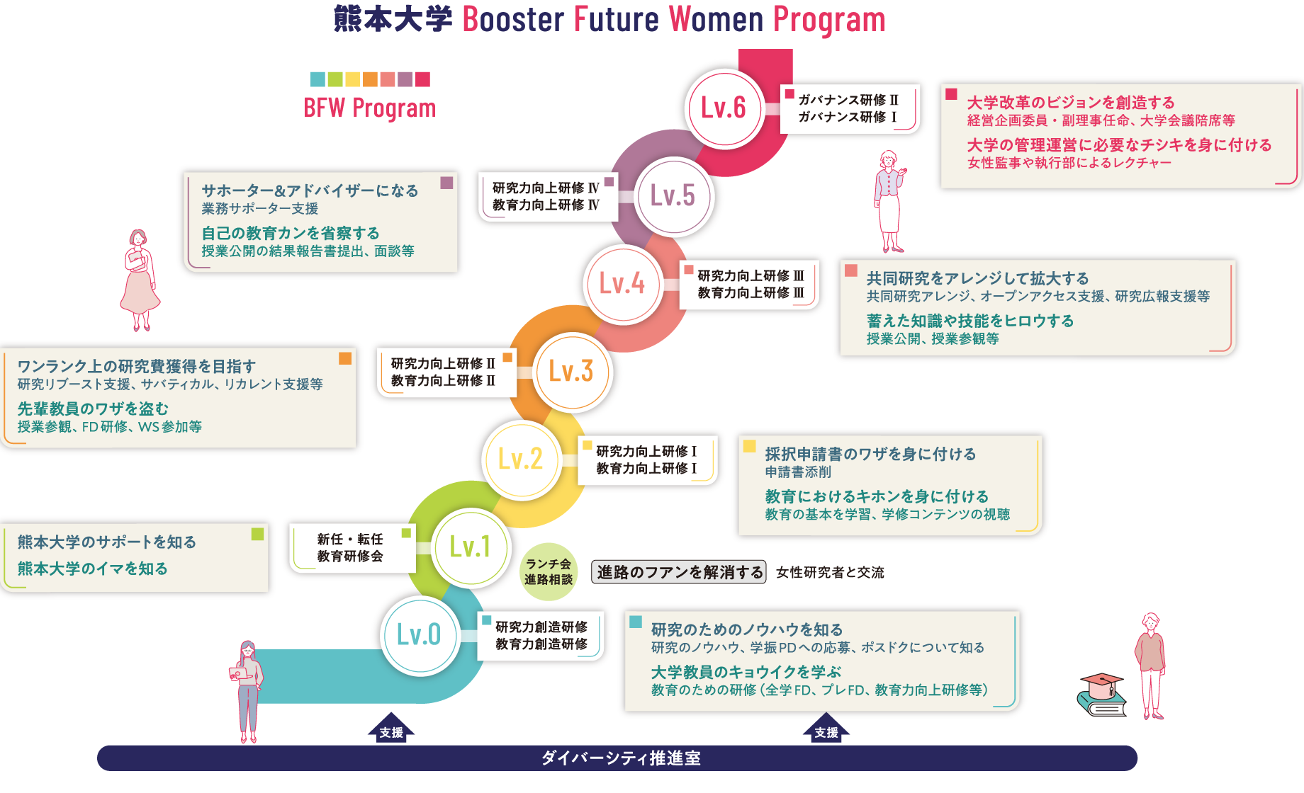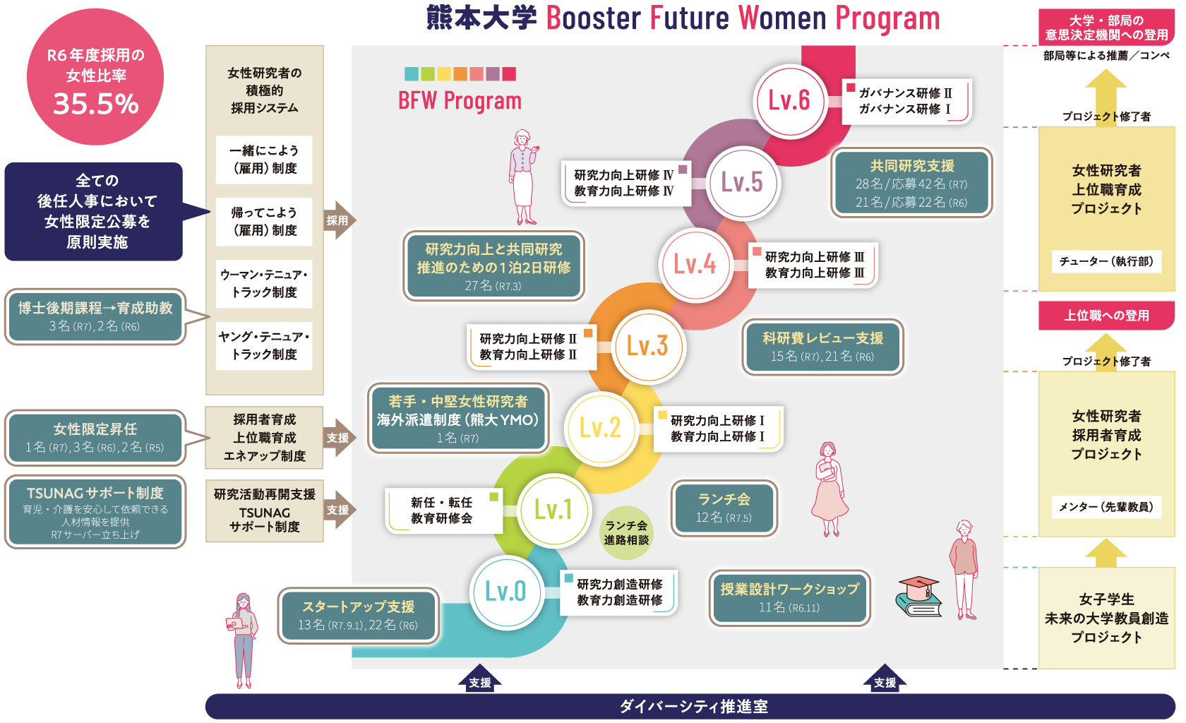 女性研究者のライフイベント等に配慮した研究環境をこれまで以上に充実するとともに、特色ある雇用制度を創設し、新規採用者における女性研究者の割合を増加します。また、研究者の育成過程に応じた研究力・教育力向上プログラムを構築し実施することで、中長期的な女性研究者の定着を図り、安定的な上位職登用を促進します。さらに、大学マネジメントを実践的に学ぶガバナンス研修により女性リーダーを育成し、大学・部局の意思決定機関に女性リーダーを登用します。