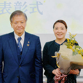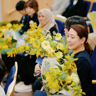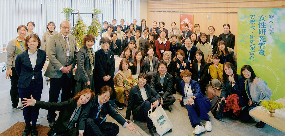 優れた研究成果を上げた女性研究者、ならびに将来性ある女性研究者を支援し、学術分野における男女共同参画推進の一助とすることを目的とした女性研究者賞。本表彰は今年で10回目を迎え、この設立にご尽力くださいました山縣ゆり子先生(当時本学男女共同参画担当副学長、現尚絅大学・尚絅大学短期大学部学長)にもご臨席頂きました。表彰式では、女性研究者賞の佐野利恵氏(生命科学系)、女性研究者奨励賞の松石佳奈氏(人文社会科学系)、Zannatul Mumtarin Moushumy氏(自然科学系)、淺井理恵子氏(生命科学系)、古賀沙緒里氏(生命科学系)に、それぞれ小川久雄学長から楯とミモザの花束が授与されました。