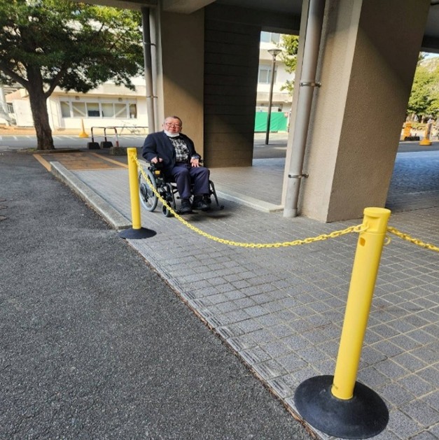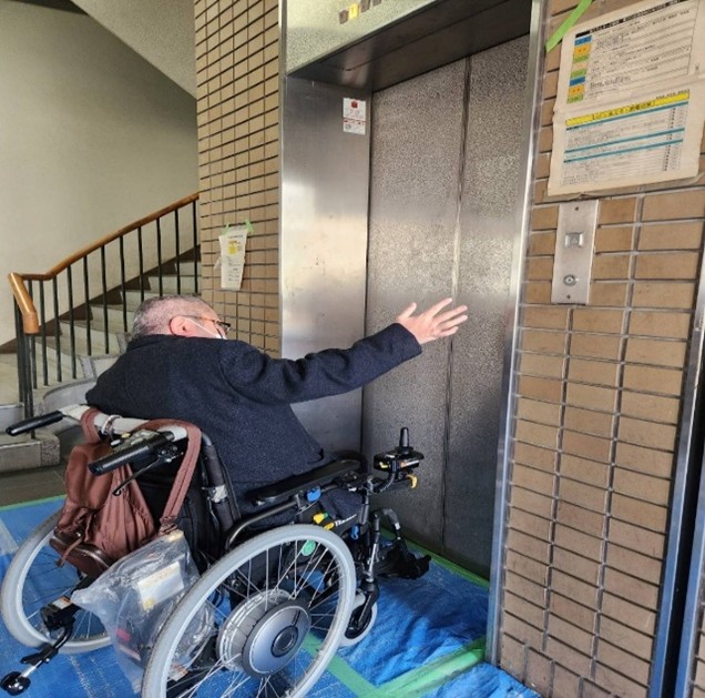 車椅子の場合、通れる通路が限られるので、遠回りをしないと目的地にたどり着けない事がままあります。これに加えて、通路にでこぼこが多いため、中村先生曰く、サスペンションの効かない車椅子の場合、衝撃がかなり腰に来るそうです。さらに、自転車が建物入り口のスロープを塞いでいて通れないこともあるそうです。これについては、本推進室で黄色のポールを設置しました。この他にも、座ったままでは届かないエレベーターのボタン、重くて押せない入り口のドアなど、キャンパス内の社会的障壁は思っていた以上に高めです。このような状況について中村先生からは「キャンパス内の建物は、一つ一つ違います。比較的新しい建物のエレベーター、部屋の入り口は使いやすいですが、古い建物には一人では使用できないものが多いです。現在、私は部屋移動の際、事務職員の方などに付き添いやドアの開閉をお願いしています。」といったコメントを頂いています。